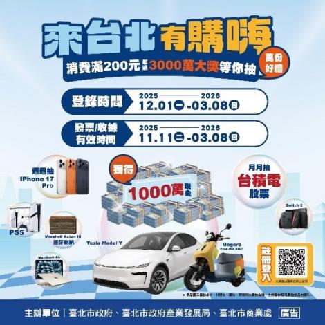 200元發票快留下!來台北有購嗨,114年11月11日至115年3年8日全市消費滿200元登錄發票收據即可抽獎,特約店家消費抽獎機會再加倍! iPhone、台積電、特斯拉、千萬現金,萬份獎項總值3千萬通通送給你。活動網址: https://www.gotaipei.taipei/