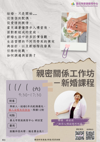 歡迎參加臺北市家庭教育中心 11 月 1 日免費課程 「親密關係工作坊:學習婚姻的調適與面對!」,請至 官網查詢、報名。