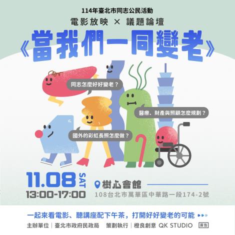 𝟮𝟬𝟮𝟱 #臺北市同志公民活動 來囉.ᐟ.ᐟ.ᐟ 每個人都會變老,你是否想過,有一群特別的長者:#老年同志他們的處境與需求經常被忽略?👵👴 臺灣同性婚姻自108年5月24日合法化至今,同志在婚姻與育兒成家已有一定進展,然而在同志多元議題中,老年同志的面貌及需 ...更多