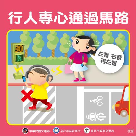 臺北市政府交通局,提醒您,路況多變,為了你我安全,車輛至路口中心點再轉彎,避免視野死角,行人穿越路口請走行人穿越道,專心過馬路,不滑手機、遵守號誌並快步通行,綠燈秒數足夠再過馬路。